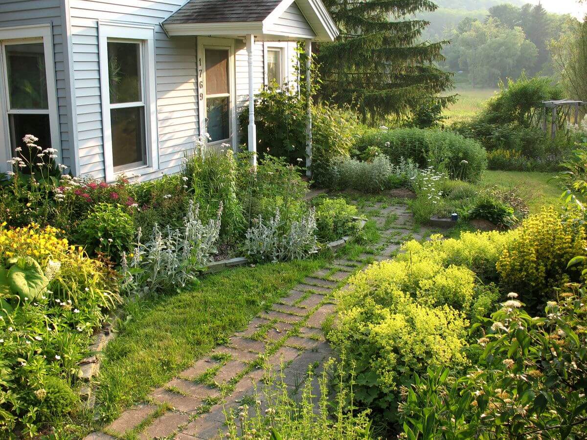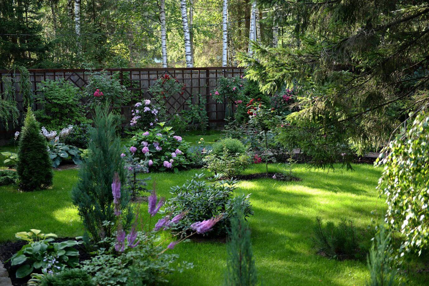 Природный дизайн сада полностью исключает декоративную стрижку деревьев и травы, ровные линии, чёткие границы между зонами.