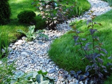 Красивое извилистое русло превосходно смотрится на фоне зелёного газона, но гораздо более эффектно выглядит сухой ручей на участке с разнообразными декоративными растениями. Здесь важно не перестараться: слишком изобильная растительность, разрастаясь, закрывает русло, и очаровательный поток превращается в неопрятные кучки камней или щебня. Поэтому сорта растений, которые будут высажены на берегах, следует выбирать очень тщательно, с учётом возможного роста.