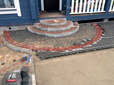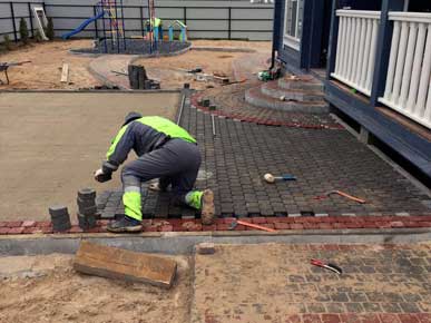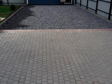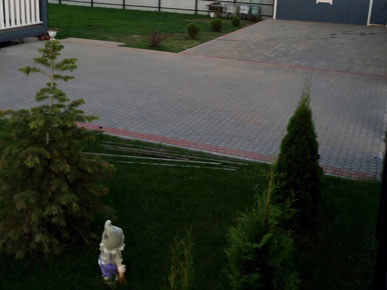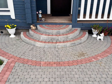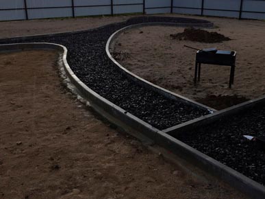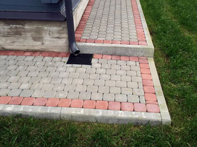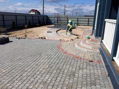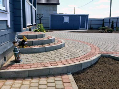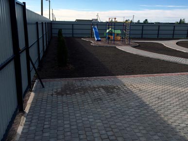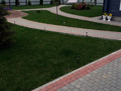 Начали работы с планировки и разметки зоны мощения. Затем вынимали грунт и распределяли его по участку, тем самым поднимая и выравнивая его. Провели трубы для отвода ливневых вод с крыши дома. После подготовки основания под мощения, были установлены садовые бордюры (1000-200- 80мм). По радиусу бордюр распиливается на части так, чтобы дуга загиба имела как можно меньше резких углов. Для мощения на этом участке выбрали тротуарную плитку «Классика» серого и красного цвета.