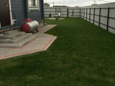 На объекте в пос. Ахмузи наша компания выполняла работы по мощению зоны парковки у дома, тропинок из тротуарной плитки и устройство посевного газона.