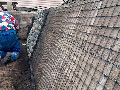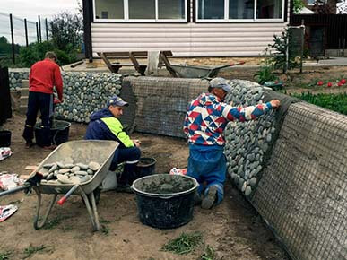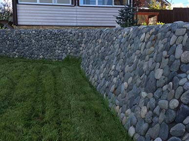 Для облицовки выбрали декоративную гальку «пестрая». Этот камень смотрится очень фактурно и создает эффект старинной каменной подпорной стенки. Камень монтировали на жесткую монтажную сетку с использованием лучших клеящих смесей. Работу завершили, покрыв подпорную стенку тремя слоями гидрофобизатора с эффектом «сухого» камня.