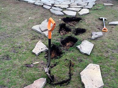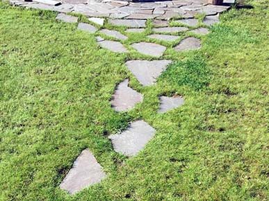 Выполненные работы: тропинка и площадка из песчаника; пошаговая дорожка; облицовка подпорной стенки. Срок выполнения работ: 7 дней.