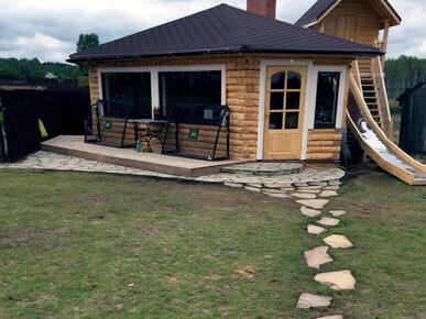 На этом объекте нашей задачей было облицевать подпорную стенку галькой, замостить тропинку и площадку у беседки серо-зеленым песчаником, выложить ступень из природного камня, сделать пошаговую дорожку.