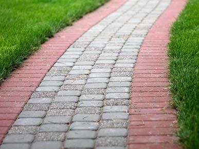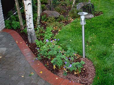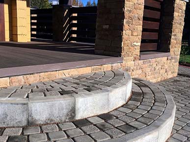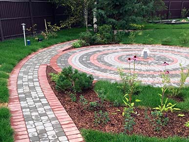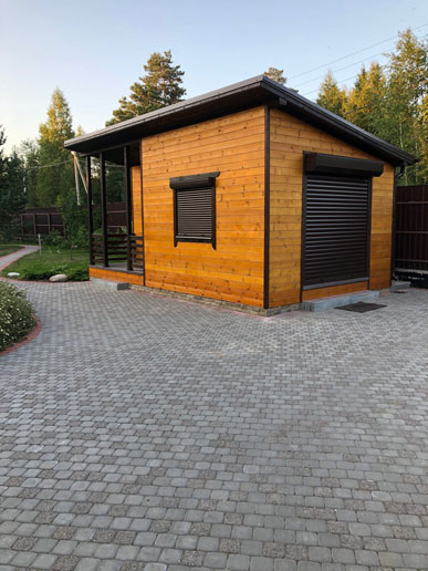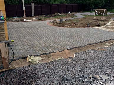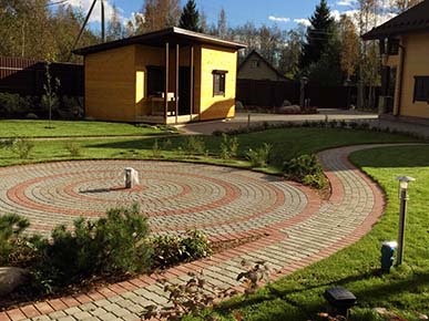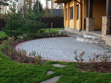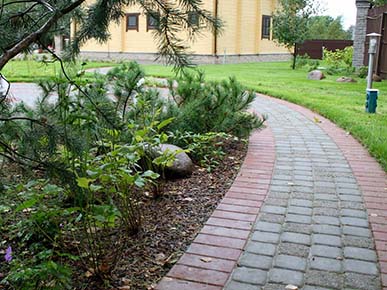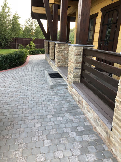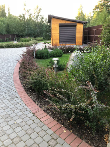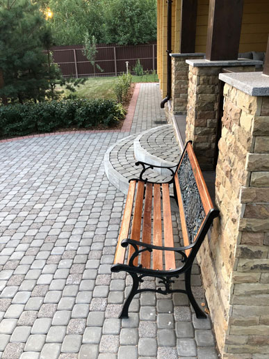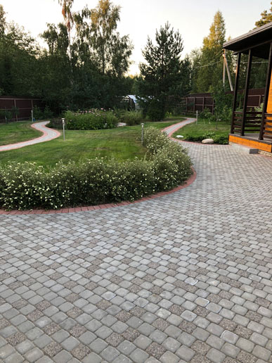 Для мощения использовали тротуарную плитку «классика серая» с вкраплениями фактурной тротуарной плитки с гранитной крошкой, по периметру мощения тротуарная плитка «брусчатка красная». Добавления плитки с фактурным гранитным слоем всегда смотрится очень эффектно без излишней яркости в мощении. Красный камень по окантовке выделяет границу мощения и визуально увеличивает площадь.