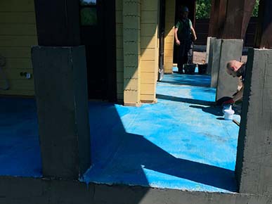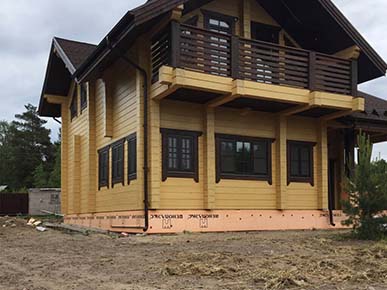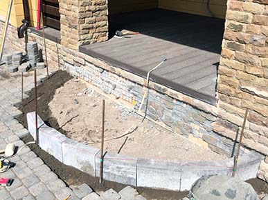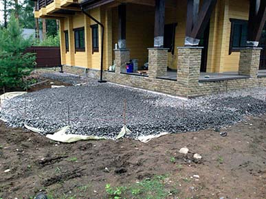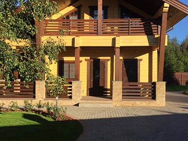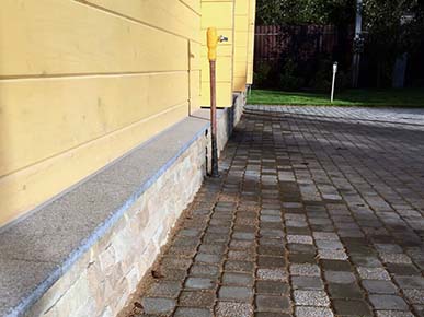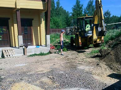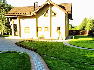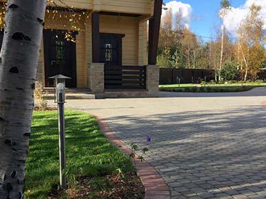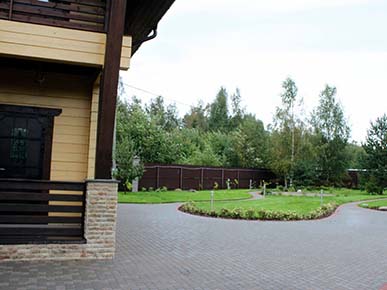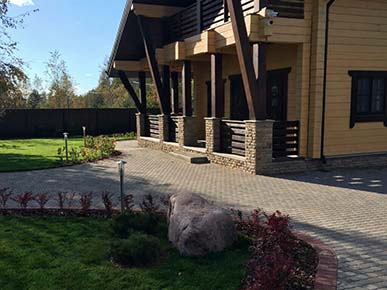 На этом объекте нашей задачей было сделать полный комплекс работ по благоустройству территории. Начали с планировки участка трактором, вывезли весь лишний грунт. Далее подготовили основание под мощение, параллельно прокладывая необходимые трубы под отвод ливневых вод. Закладывали кабеля под освещение, утеплили отмостку и цоколь дома. Была произведена гидроизоляция цоколя и террасы. Затем цоколь и колонны дома облицевали пиленым песчаником желтого цвета, а отливы сделали из серого гранита.