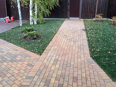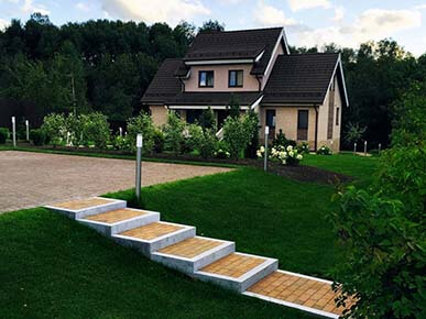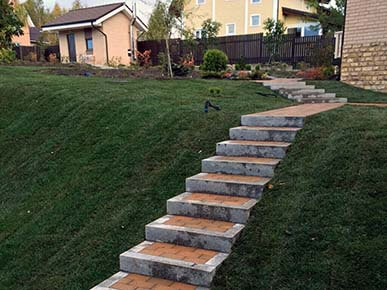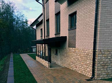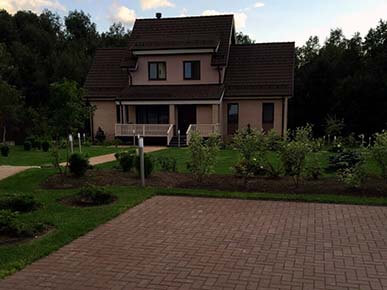 Для мощения на этом объекте использовался немецкий клинкер «Feldhaus» коричневого и песочно-желтого цвета. Ступени лестниц были выполнены из серого гранитного бордюра. Это отличное сочетание природных материалов, которые придают незабываемый вид и эксклюзивность всему участку. На подготовленное основание расстелили рулонный газон. Так же выполнена посадка разных видов растений, очень гармонично сочетающихся и создающих правильный законченный вид идеального загородного дома.